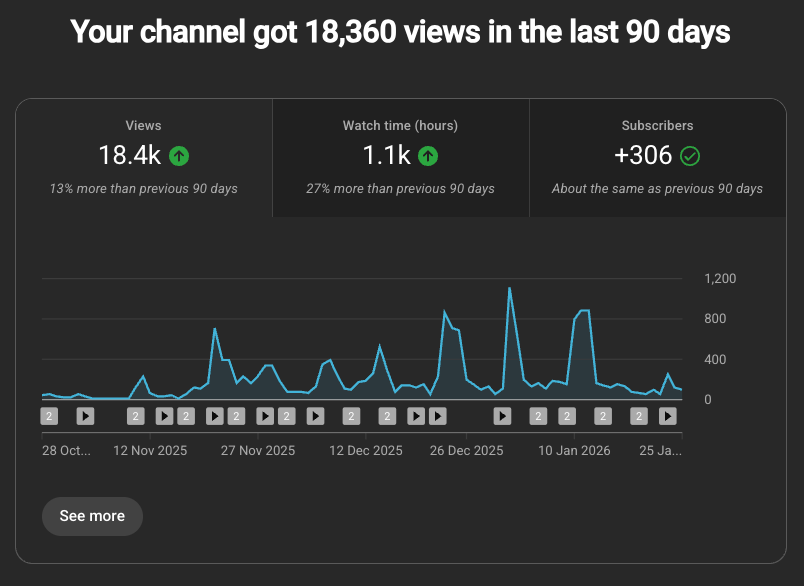 The first 9 months are what I call The Ghost Phase. You are shouting into the void. My goal right now is simply to reach monetization (1,000 subscribers and 4,000 watch hours). I am at Month 7. In theory, I should hit it in two or three months. But the growth isn’t a straight line; it is erratic and frustrating.